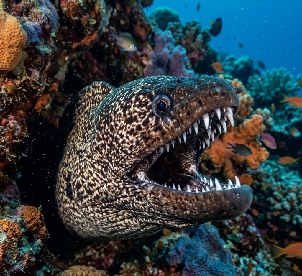 Wenn man beim Tauchen oder Schnorcheln in einem Korallenriff unterwegs ist, gehört eine Begegnung mit einer Muräne oft zu den eindrücklichsten und manchmal auch beängstigendsten Momenten. Ein schlangengleicher Körper, der aus einer dunklen Felsspalte ragt, ein Kopf, der starr in die Ferne blickt, und vor allem: ein ständig geöffnetes Maul, das eine Reihe rasiermesserscharfer Zähne offenbart. Schnell entstehen Assoziationen mit Monstern und Gefahren. Doch was steckt wirklich hinter diesem furchteinflößenden Anblick? Ist die Muräne tatsächlich das aggressive Monster, als das sie oft dargestellt wird, und was ist die Wahrheit über ihre Zähne?